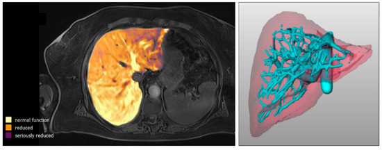 Example of image analysis. Visualization of liver function over the entire liver with the AI-based software prototype (left) and 3D view of the liver and vascular supply (right).