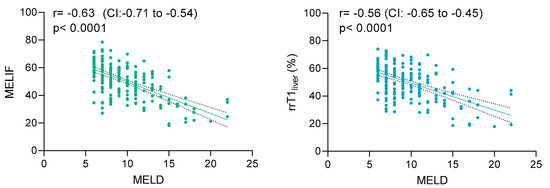 To analyze the relationship between the MELIF and rrT1liver scores and the MELD score, Pearson’s correlation was used (Figure 3). The MELIF score showed a significantly strong negative correlation with the MELD score (r = −0.63). However, this correlation was stronger than the correlation between the rrT1liver score and the MELD score. Nevertheless, the rrT1liver score also showed a significantly strong negative correlation with the MELD score (r = −0.56).