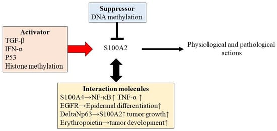 Epigenetic regulation has been postulated as one mechanism underlying S100A2 regulation, especially in malignancies. Epigenetic chemical modification of DNA itself or DNA-binding proteins, such as histones, changes gene expression without altering the sequence [28,29,30] (Figure 1).