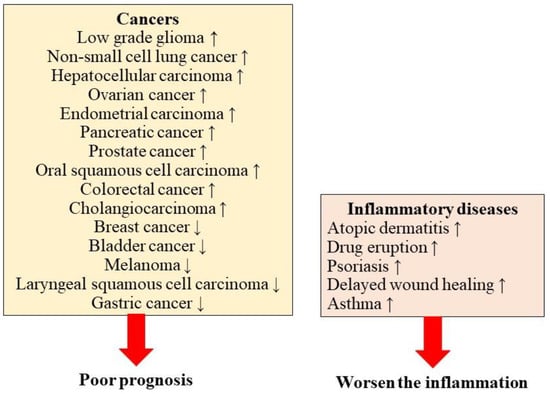 The prognostic impact or the severity of influences is summarized in this figure. Although S100A2 has a tumor suppressor function, the recently updated research focusing on the prognostic impact of S100A2 revealed the various influences of S100A2 in human malignancies in addition to inflammatory diseases. High S100A2 expression was associated with a better prognosis in patients with breast cancer, bladder cancer, melanoma, laryngeal squamous cell carcinoma, and gastric cancer. On the other hand, a high expression of S100A2 was associated with a poorer prognosis in patients with nonsmall-cell lung cancer, hepatocellular carcinoma, ovarian cancer, endometrial carcinoma, pancreatic cancer, prostate cancer, oral squamous cell carcinoma, colorectal cancer, cholangiocarcinoma. S100A2 was also involved in the development of inflammatory reactions, atopic dermatitis, drug eruption, psoriasis, delayed wound healing, and asthma.