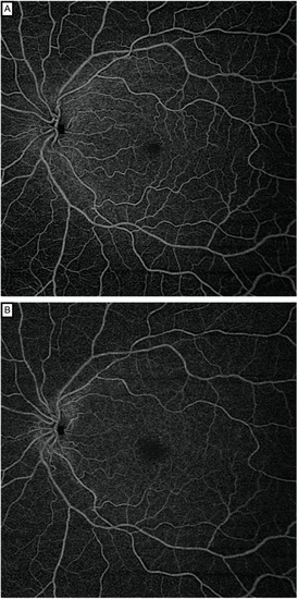 Swept-source optical coherence tomography angiography 12 × 12 mm en face images segmented through the superficial (A) and deep capillary plexus (B) of a healthy subject. The Plex Elite automatically provided an image of the SCP and DCP, using default slabs, the inner and outer boundaries of which were set at the inner limiting membrane and inner plexiform layer–inner nuclear layer (SCP) interface and the inner plexiform layer–inner nuclear layer and outer plexiform layer–outer nuclear layer (DCP) interfaces.