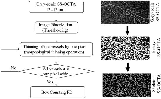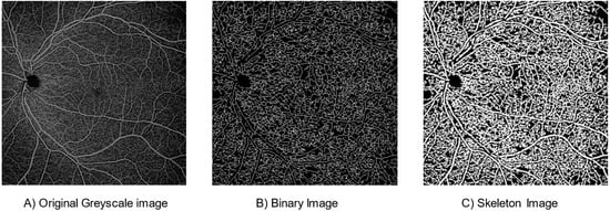 To obtain the box-counting FD, the skeletonised images were superimposed on a grid of squares and the total number of boxes (squares) containing at least one pixel of the structure were counted. This process was repeated continuously by reducing the mesh size in each step (increasing the total number of meshes covering the entire image). All data points (total number of meshes counted in each step vs. mesh size) were plotted on a log–log plot and the slope of the line with the best fit to the data was taken as the measurement of box-counting FD. This measure was bounded on the interval [0, 1]. Lower FD values correspond to low complexity of vessel branching, while higher values correspond to greater complexity [10]. The framework of the image processing steps is shown in Figure 2. Examples of swept-source optical coherence tomography angiography: original and processed OCTA images from a single patient as shown in Figure 3, which enables better visualisation and comparison of two processed images, and a skeleton image with modified colour to red and with superimposed original grayscale (Supplementary Materials, Figures S1 and S2).