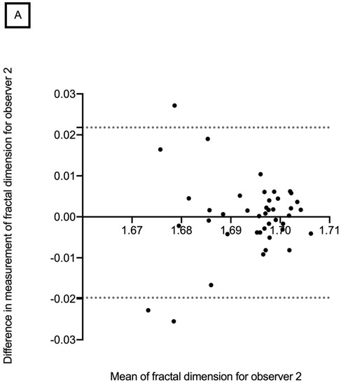 The Bland–Altman plot of the intra-observer repeatability of the retinal vascular network fractal dimension in the SCP showed that differences increased significantly with decreasing FD measurements (Figure 5). This could introduce a proportional bias as lower FD could suffer from a higher level of noise.