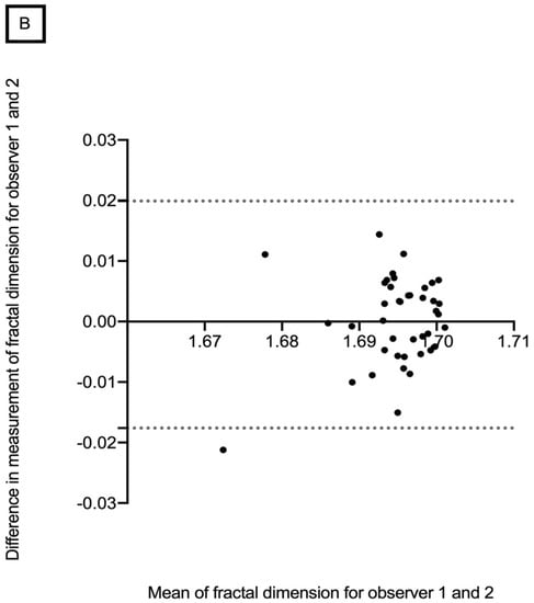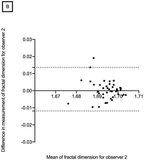 The mean retinal vascular network FD in the superficial vascular layer was 1.694 ± 0.010 (range, 1.656–1.709) for observer 1 and 1.693 ± 0.014 (range, 1.610–1.708) for observer 2. The mean retinal vascular network FD in the deep vascular layer was 1.695 ± 0.007 (range, 1.662–1.704) and 1.693 ± 0.011 (range, 1.624–1.705), for observers 1 and 2, respectively (Table 2). No significant difference was found between the two observers in terms of mean retinal vascular network FD for all measurements. Bland–Altman plots were used to demonstrate differences in overall mean FD measurements for the intra-observer repeatability and inter-observer reproducibility in the SCP and DCP (Figure 4 and Figure 5). The CV for each observer was less than 5%, which indicates low variability and, therefore, good reproducibility (Table 2).