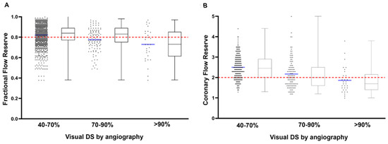 Box-and-whisker and scatter plots showing the FFR (A) and CFR (B) values of all lesions in the category of DS 50–70%, DS 70–90% and DS > 90% as determined by visual estimation during coronary angiography. The red dashed horizontal lines represent clinical cut-off values of FFR (≤0.80) and CFR (<2.0).