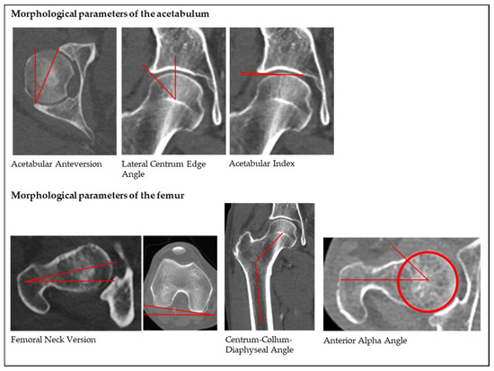- Gollwitzer, H.; Suren, C.; Strüwind, C.; Gottschling, H.; Schröder, M.; Gerdesmeyer, L.; Prodinger, P.M.; Burgkart, R. The natural alpha angle of the femoral head-neck junction: A cross-sectional CT study in 1312 femurs. Bone Joint J. 2018, 100, 570–578. [Google Scholar] [CrossRef]