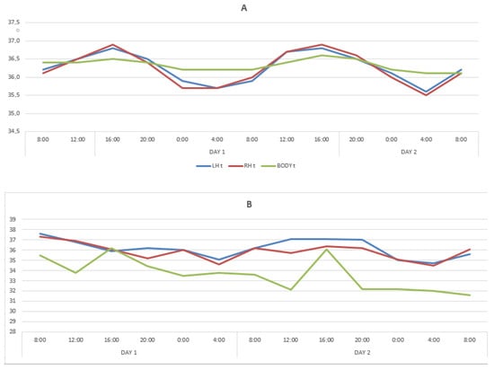 The periods of one complete temperature fluctuation for LBT and RBT exactly coincided and strictly corresponded to the circadian rhythm (24 h) on the first and second days. During the acrophase period (04:00), the temperatures of the LBT, RBT, and BT did not differ statistically, whereas during the bathyphase period (04:00) on the first and second days, the temperature of the LBT and RBT turned out to be statistically significantly lower than the BT. The maximum amplitude of temperature deviations of the LBT on the first and second days was 1.1 °C and 1.2 °C, the RBT was 1.2 °C and 1.4 °C, and the BT was 0.4 °C and 0.7 °C.