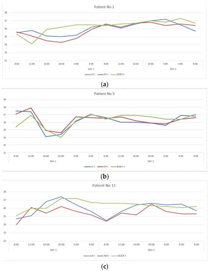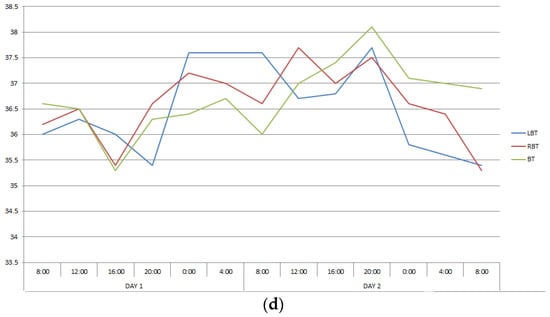 Changes in the LBT, RBT and BT in patients No. 2 (a), No. 5 (b), No. 11 (c), No. 17 (d) during the entire measurement period.