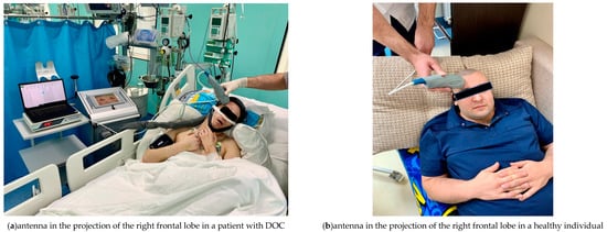 For measurements, the MWR2020 antenna with a diameter of 32 mm was installed in the projection areas of the frontal lobes of the cerebral cortex on the left and right of the healthy individuals and patients with DOC (Figure 3), pressing it tightly to the skin surface. To obtain an accurate measurement of the internal temperature, it was necessary to tightly attach the working surface of the antenna to the examined area. The skin area had been prepared in advance so that there was no sweat or other possible fluids on it that might interfere with the measurement. A temperature was considered an artefact if was less than 32 °C or more than 42 °C. Artefactual readings were replaced by the average value of the three times remeasured temperature at the same projection area. The obtained temperature measurements were then entered into a spreadsheet in MS Excel (Microsoft Corporation. Microsoft Excel) and used for plotting as well as for database for statistical analysis. The results were obtained in August–September 2021.