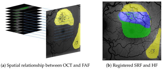 Previous works have proposed several methods for the registration of FAF and other en face imaging modalities [,,,,,,,]. Similarly, efforts have been made to visualize OCT labels, e.g., by projecting them onto the accompanying en face infrared (IR) image, where B-scan positions are marked by the OCT device [,] or a joint reference space []. In [] an en face image is created by reducing the OCT volume. Still, neither kind of approach alone allows registration between OCT and FAF findings.