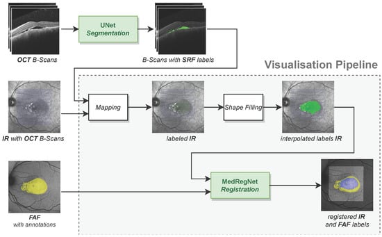 Our visualisation pipeline itself consists of the components: (1) the mapping function for projecting segmentations from OCT B-scans onto the corresponding IR image, (2) the shape filling algorithm to interpolate segmentations in the gaps between the B-scans, and (3) the MedRegNet registration module [] to register the IR image and its segmentations onto the FAF image. Each component including the segmentation network is explained in the following subsections. Implementations of all components are given in the Supplementary Materials.