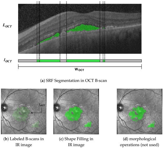 From Figure 3b, the gaps in the IR image between the labeled B-scans become apparent. Szeskin et al. [] used morphological dilation and closing operations with experimentally determined parameters for closing the gaps. We found that this approach does not work well in our case, where OCT slices only number 25 of them compared with the 40–80 in [] (compare Figure 3d). Instead, we used a shape-based interpolation method, as in [], though simplified for use in 2D.