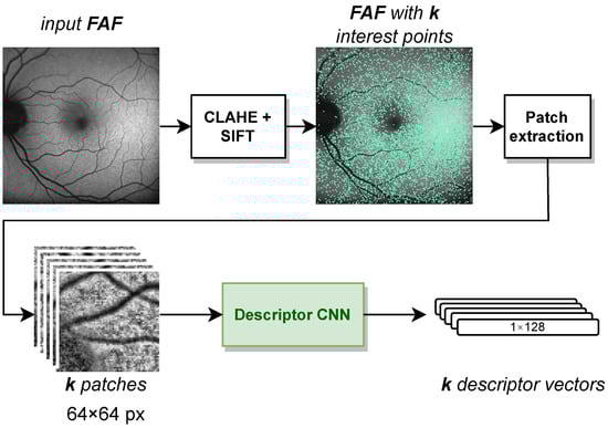 To project the interpolated labels onto the FAF image, we need to register the IR image with the FAF image. For this, we used the feature-based multimodal MedRegNet descriptor module [], as depicted in Figure 4. MedRegNet utilizes established point-detector algorithms such as SIFT [] to detect interest points in both images. Rectangular px patches are extracted around each interest points. These patches serve as input to MedRegNet’s lightweight convolutional neural network (CNN), which outputs for each patch a l2-normalized descriptor vector .