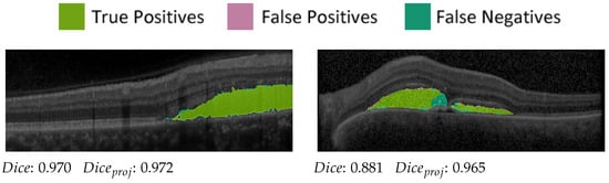 Furthermore, projection accuracy in our pipeline depends not on correct segmentation in the OCT volume itself but rather on correct segmentation in regard to the en face plane. Hence, to prove the suitability of the SRF segmentations for our visualisation pipeline, we projected ground-truth and predicted segmentation onto the en face plane. Pixels in the projection image were assigned a value of one if at least one voxel was segmented in the corresponding A-scan and zero otherwise. The Dice score of the projection images (compare Figure 5) was then calculated and averaged over all available examinations. We achieved a projected Dice score of 0.897, which highlights the reliability of the SRF segmentations in the en face plane.