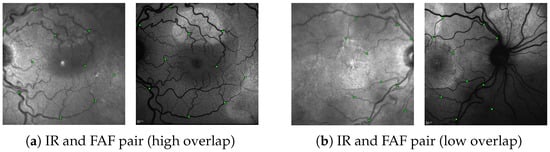 For our usecase, we utilized the multi- and monomodally pre-trained MedRegNet models of [] without further training. We referred to the latter as MedRegNet. The multimodal MedRegNet as detailed in [] was trained with SIFT points on the three image modalities FAF, fluorescein angiography (FAG) and fundus. MedRegNet was trained with SIFT points on the public fundus images of [,]. Both sets of training were performed on a NVIDIA Titan Xp GPU and an Intel Core i7-4790K CPU with 4.00 GHz.