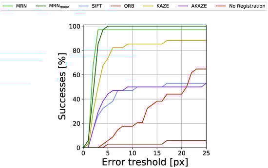To show that IR↔FAF registration is no trivial task, we also present the registration performance of the common interest pointer detector and descriptor algorithms SIFT [], ORB [], KAZE [] and AKAZE [] as well as scores for not carrying out any registration at all. For each method, we chose the with the respective highest AuC to avoid selection bias. The results are given in Table 2 and Figure 7.