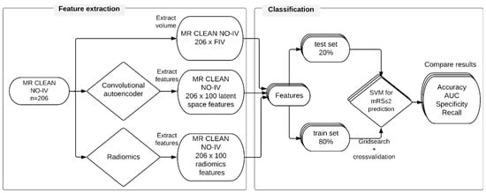 The radiomic-feature-based SVM outperformed the CAE-feature-based SVM and was best at correctly classifying patients with favorable outcomes: 20% of the patients for whom a favorable outcome was predicted by the radiomic-features-based SVM did not achieve functional independence, compared to 25% for the CAE-feature-based SVM. However, the recall for the radiomic-feature-based classifier was only 65%, while for the CAE-feature-based SVM, 73% of patients with favorable outcomes were selected. Considering these results, we think that the CAE-feature-based SVM is more appropriate for clinical decision making since patients with the potential for a favorable outcome should not be missed.