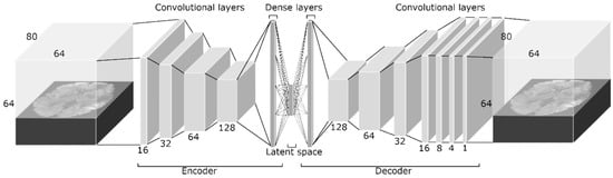 The convolutional autoencoder architecture. The dimensions of the input image were 64 × 80 × 64. The encoder consisted of four 4 × 4 × 4 convolutional layers with stride 2 and rectified linear unit activation. For each subsequent convolutional layer, the number of filters was doubled, starting at 16. Each convolutional layer was followed by group normalization. After the final convolutional layer of the encoder, the feature space was flattened, and a dense layer was added. The decoder contained the same components as the encoder in the opposite direction, except that the feature space was upsampled first by a factor of 2, and the stride of the convolutional layers was kept at 1. After the fourth convolutional layer, three additional convolutional layers reduced the fourth dimension of feature space to 1, resulting in the original image dimensions.