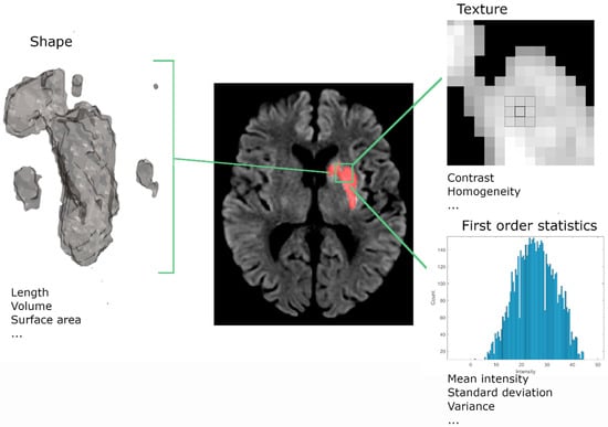 Radiomic features extracted from medical images aim to identify and quantify pathological effects that may be invisible to the human eye [20]. Radiomic features are extracted from a region of interest (ROI), in our case, the infarct lesion, and include first-order statistics, shape, and textural features (Figure 3). Examples of first-order statistics are minimum, maximum, and mean intensity within the lesion. Shape features contain both 2D metrics, such as the maximum diameter within a slice of the ROI, and 3D metrics, including the 3D volume of the ROI. Textural features are computed using filtering methods and matrices that capture the relationships between multiple voxels. An example of these matrices is the gray-level size zone matrix (GLSZM), which represents the number of neighboring pixels with the same intensity. Metrics computed from this matrix represent coarseness and homogeneity within the lesion. In total, 100 radiomic features were extracted using the PyRadiomic Toolkit [20].