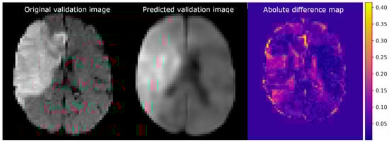 The training MSE of the CAE was 2.0 × 10−3 (arbitrary units), and the validation error was 5.1 × 10−3. Figure 4 shows the reconstruction of a validation image (left) established by the CAE (middle) and the corresponding difference map (right). The difference map shows small intensity differences in most of the healthy brain regions. The largest differences in intensities were present at the transition between brain tissue and cerebral spinal fluid. It is of note that some predicted voxels within the lesion and ventricles also differed in intensity from the original. The CAE was able to reconstruct the lesion at a location similar to that of the original image.