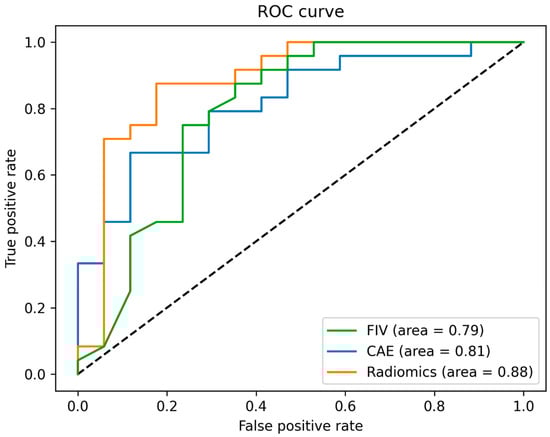 Table 1 shows the results of the best-performing classifiers that were trained on FIV, CAE-selected features, and radiomic features. We found the highest test accuracy for the FIV-based SVM classifier (0.74). The precision was highest for the radiomic-features-based SVM classifier (0.80), while the recall was highest for the SVM classifier based on FIV (0.73). Based on the AUC (Figure 5), the SVM classifier trained on radiomic features showed the best performance (0.88). However, this improved outcome prediction was not statistically significant compared to the model based on FIV (p = 0.15) or the model based on the CAE-trained SVM classifier (p = 0.37).