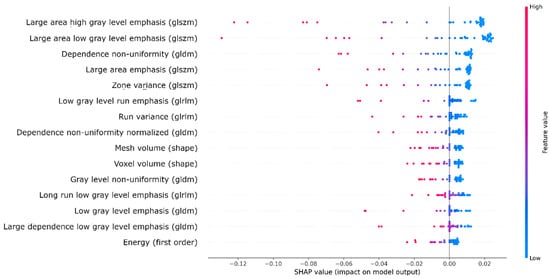 SHAP summary plot showing the top 15 radiomic features (and their feature classes) in terms of impact on the classification based on the SHAP values. Negative and positive SHAP values represent unfavorable and favorable outcome classifications, respectively. The feature values are represented by a color map, ranging from blue (low value) to red (high value). Abbreviations of second-order radiomic feature classes in gray-level matrices: size zone (glszm), dependence (gldm), and run length (glrlm).