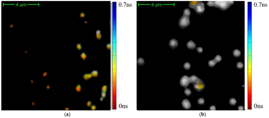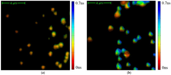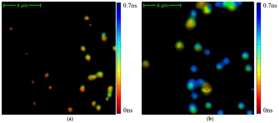 The results of the average TPAF lifetime image of exosome samples processed by a cutting filter: the image for the CRC patient (a) and the image the CP patient (b). The cutting filter had a threshold of 800 photons per pixel. The corresponding unprocessed images are presented in Figure 2.
