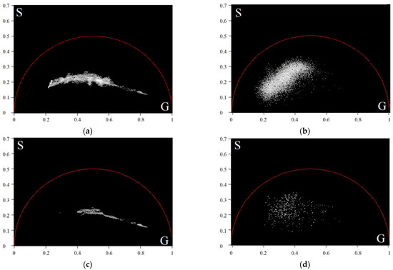 The phasor plots of the average TPAF lifetime images of the exosome samples for a CRC patient before (a) and after (b) the cutting filter processing; (c–d)—The same for a CP patient. The cutting filter had a threshold of 800 photons per pixel.