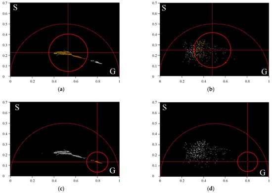 The class areas on phasor plots of the average TPAF lifetime images of the exosome samples presented in Figure 5: the first class position on the phasor plot for the CRC patient (a) and the CP patient (b), the second class position on the phasor plot for the CRC patient (c) and the CP patient (d). The first class parameters: 0.80, 0.14, and 0.51; the second class parameters: 0.53, 0.23, and 0.71. Here, are coordinates of the center and radius of the class.