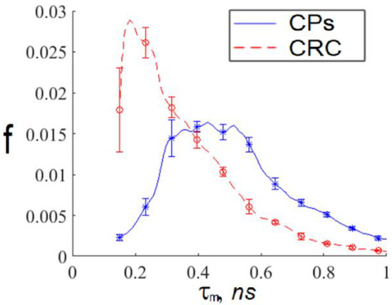 The average TPAF lifetime distributions, normalized on an area under the curve, for images of the exosome samples presented in Figure 2. Notations on the legend: CPs—the exosome sample from the randomly selected CRC patient; CRC—the exosome sample from the randomly selected CP patient. The distribution mean values and standard deviations were calculated by value-averaging over images presented in Figure 2a,b.