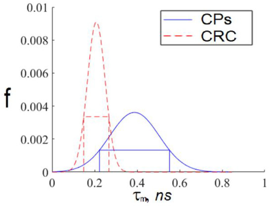 Interval approximations of the distribution functions of the short and long average TPAF lifetimes presented in Figure 8. These curves were calculated using Gaussian approximation of the data presented in Table 1. Notations on the legend: CPs—the exosome samples from the whole CRC patient group; CRC—the exosome samples from the whole CP patient group.
