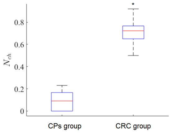 A box diagram for values for CP and CRC patient groups, * p-value is Here, is the relative number of CRC-associated exosomes in the FLIM dataset calculated according to Formula (8).