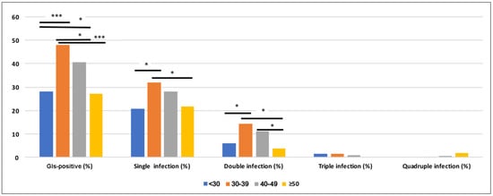 Distribution of GIs between age study groups. The statistical significance was calculated with Chi square Fisher’s exact test (p < 0.05, *; p < 0.001, ***). The risk of GIs in the age group 30–39 years was higher (Odd ratio, (O.R.): 1.66, CI: 1.23–2.24) than the other age groups analyzed. The age group 30–39 years showed a high risk for single infections (O.R. 1.98; CI: 1.45–2.71) and for double infections (O.R. 1.69; CI: 1.06–2.70) than the population analyzed.
