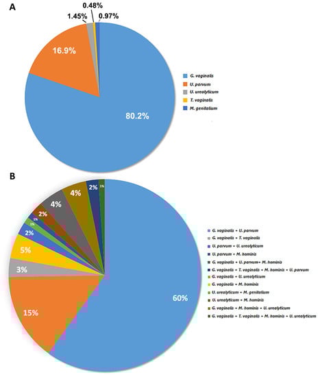 In our study, among the subjects found positive for single infections (207/717) (Supplementary Material: Table S1), G. vaginalis and U. parvum represented the most common findings with a prevalence of 80.2% (166/207) and 16.9% (35/207) respectively (Figure 2A). Other identified microbial species included U. urealyticum (3/207; 1.45%), M. genitalium (2/207; 0.97%) and T. vaginalis (1/207; 0.48%) (Figure 2A).