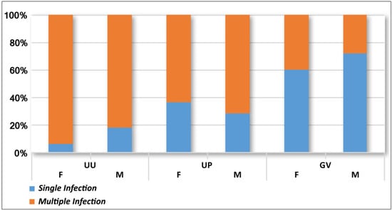 Prevalence of single and multiple infections due to U. urealyticum (UU), U. parvum (UP), and G. vaginalis (GV) in samples from female (F) and male (M) patients.