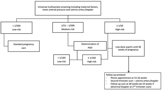 The performance of multivariate screening models is superior to methods based on maternal risk factors alone [16,17]. Recently, the FIGO Working Group on Good Clinical Practice in Maternal–Fetal Medicine endorsed first-trimester screening in singleton pregnancies, using a combination of maternal factors, UAt-PI, MAP, and PlGF at 11–13 weeks [18]. In our study, PE screening was implemented with the same software used for aneuploidy screening. This decision facilitated the integration of results and clinical implementation of the program. Moreover, this screening algorithm had been validated in our po-pulation. [4]