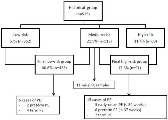 Screening results and obstetric outcomes of the historical group. PE, preeclampsia.