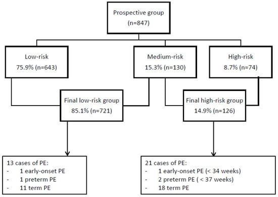Screening results and obstetric outcomes of the prospective group. PE, preeclampsia.