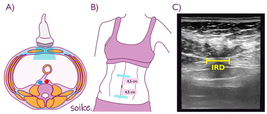 - Whittaker, J.L.; Warner, M.B.; Stokes, M. Comparison of the sonographic features of the abdominal wall muscles and connective tissues in individuals with and without lumbopelvic pain. J. Orthop. Sports Phys. Ther. 2013, 43, 11–19. [Google Scholar] [CrossRef] [PubMed]
