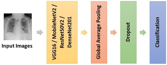 Prior to the new final classification layer, a global average pooling layer and a dropout layer are added after the pre-trained model. The global average pooling layer flattens the features from the preceding layers and produces a feature map for each class. As deep neural networks are prone to overfitting, the dropout layer added for regularization purposes to improve the generalization capability. The overall architecture of the deep neural network is depicted in Figure 2.