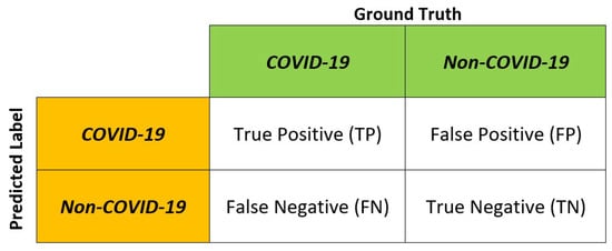 Several metrics are used in the performance evaluation of the deep neural networks—namely, the accuracy, precision, sensitivity (also known as recall), specificity and F1-score. The evaluation metrics are based on the True Positive (TP), True Negative (TN), False Positive (FP) and False Negative (FN) as depicted in Figure 3. The evaluation metrics are defined as: