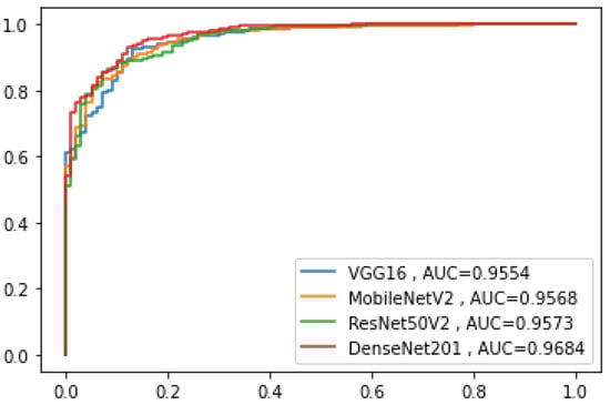 DenseNet201 recorded the highest F1-score at 0.725 with a good balance between precision and sensitivity. The training and testing times of the pre-trained models are also presented in the table. Figure 4 shows the receiver operating characteristics curve of the pre-trained models. The DenseNet201 has the highest area under the curve, which indicates that the model had relatively higher discriminating capability among the models. The confusion matrices of the pre-trained deep neural networks are presented in Figure 5.