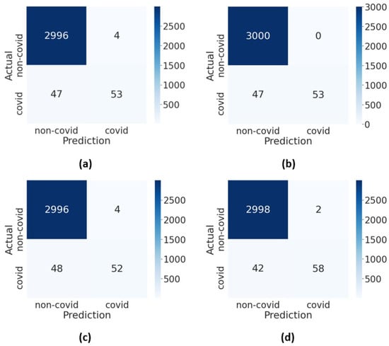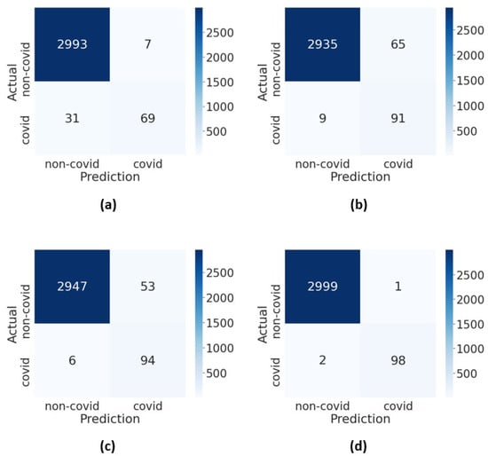 The confusion matrices of the pre-trained models: (a) VGG16, (b) MobileNetV2, (c) ResNet50V2 and (d) DenseNet201.