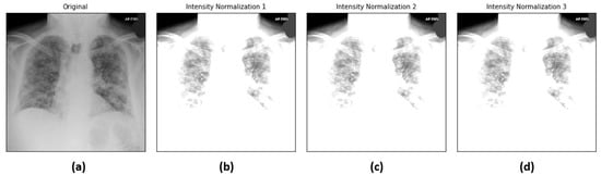 Sample chest X-ray images: (a) original, (b) intensity normalization and , (c) intensity normalization and and (d) intensity normalization .