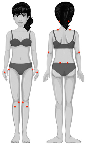 Widespread pressure pain thresholds (PPTs) were assessed with an electronic algometer (Somedic®, Sollentuna, Sweden) in the following areas: mastoid process, upper trapezius muscle, elbow, hand, posterosuperior iliac spine, greater trochanter, knee, and tibialis anterior, as illustrated in Figure 1 [23]. Pressure was applied at a rate of approx. 30 kPa/s on each point. The mean of 3 trials on each point, with a resting period of 30 s between each, was calculated and used in the analysis. This testing procedure showed good reliability (ICC ≥ 0.88) in patients with FMS [24]. Since no side-to-side differences were found at any assessed point (independent student t-tests), the mean of both sides was used in the analysis.