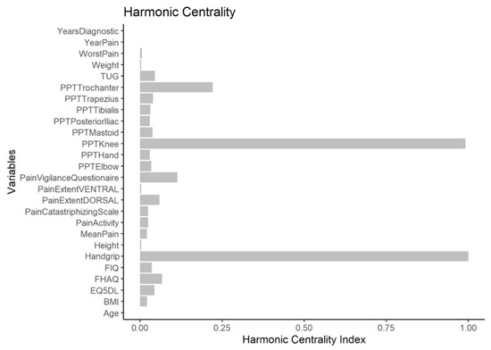 Since closeness centrality cannot be calculated for the unconnected nodes found in this study [46], harmonic centrality was assessed. This estimate provides information about whether a node influence can reach other nodes more quickly than other peripheral ones due to the shortest paths connecting itself and other nodes [34,51,52].