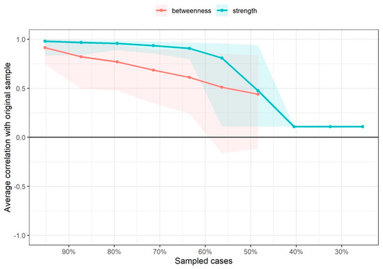 For assessing the variability of the centrality indices (CS-coefficient), a participant-dropping subset bootstrap was utilized [53]. This approach drops a percentage of participants and re-estimates the network and the three related centrality indices. The CS coefficient (correlation stability) reflects the maximum proportion of data that can be dropped (ideally >0.25 [13,52]) to retain a correlation >0.7 with the original centrality indices (95% certainty) [53].