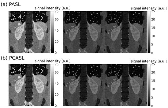 Tissue specific parameters (relative proton density ρ, T1 and T2 relaxation times at field strengths of 3 T) were taken from the literature [19,20,21]. Coronal-oblique slice position (rotation angle of 12°), voxel dimension of 3 mm × 3 mm × 5 mm repetition time TR = 5000 ms, and echo time TE = 23 ms were chosen to match recommendations for in vivo acquisitions [17]. Noise was modeled as an additive white Gaussian noise to produce signal-to-noise ratio similar to in vivo acquisitions. Respiratory motion during free-breathing acquisition was simulated by generating 100 synthetic MR images at equally spaced time points around the exhalation part of the breathing cycle. ASL data sets with a total of 51 images (one M0 and 25 control–label pairs) were then generated by randomly selecting 51 images from the available 100 time points. Background suppression used for control and labeled images was modeled by reducing the signal intensity of all control and labeled images to 20% of the signal of the M0 image [22]. Assuming the apparent longitudinal relaxation time of tissue equals the longitudinal relaxation time of arterial blood, the general kinetic model [23] was used to create both pulsed ASL (PASL) and pseudo-continuous ASL (PCASL) data sets. To reproduce healthy kidneys, a perfusion ratio of five was assumed between cortex and medulla [24], with cortical perfusion set to 250 mL/100 g/min and medullary perfusion set to 50 mL/100 g/min. Arterial transit times of 1123 ms and 1141 ms were assumed for the medulla and cortex, respectively [25]. In addition to data sets with healthy perfusion, a PCASL data set with abnormal perfusion in the right kidney (cortical perfusion of 100 mL/100 g/min and medullary perfusion of 20 mL/100 g/min) was also generated using the body model 92. For all PASL data sets, the inversion time TI and the labeling duration TI1 were set to 1800 ms and 1200 ms, respectively. For all PCASL data sets, the post-labeling delay PLD was set to 1200 ms and the labeling duration τ was set to 1600 ms. The synthetic ASL data sets presented here are available for download under https://doi.org/10.11588/data/QAHWSF (accessed on 28 July 2022 ).