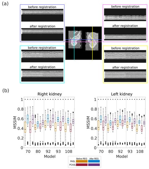 Horizontal and vertical line profiles for both right and left kidneys of a synthetic ASL data set are shown in Figure 2a. Some movement is visible between subsequent ASL images in both horizontal and vertical direction before registration. The movement is noticeably reduced after the registration as indicated by the smoother line profiles and the less abrupt changes in signal intensity. Quantitative evaluation of the registration for all available healthy data sets is shown in Figure 2b in terms of MSSIM distributions before and after registration. For each model, the MSSIMs increase after registration, indicating that the resemblance between all images compared increases with the registration. Before registration, mean and standard deviation of MSSIMs across all healthy data sets were 0.4 +/− 0.2 and 0.4 +/− 0.1 for PASL and PCASL, respectively. After registration, mean and standard deviation of MSSIMs across all healthy data sets were 0.5 +/− 0.2 and 0.5 +/− 0.1 for PASL and PCASL, respectively. The comparison includes the comparison of identical images, which explains the MSSIM outliers equal to 1 in each distribution. The lowest MSSIMs were obtained for comparisons between M0 and all control or labeled images as M0 differs from all other ASL images in terms of intensity due to the assumed background suppression. As expected, the MSSIM values differed little between PASL and PCASL data sets. Across all models, no difference in MSSIM distributions could be observed between left and right kidney (0.4 +/− 0.2 before registration and 0.5 +/− 0.1 after registration for both).