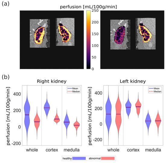 Kidneys are mainly responsible for the excretion of waste materials produced by body metabolism via urine [1]. They are also key for maintaining steady internal chemical and physical conditions in the body by controlling blood pressure, acidity, hemoglobin levels, and regulating the electrolyte balance. Good kidney function is directly dependent on normal blood flow, making it an important renal biomarker. Acute kidney injury and impaired perfusion are in fact closely associated [2,3]. Furthermore, cortical perfusion has been found to be decreased in patients suffering from chronic kidney disease [4,5,6,7] and to vary depending on the disease stage [8]. Perfusion is also critical for renal allografts [9,10,11] and allows differentiation between allograft rejection and tubular necrosis [12].